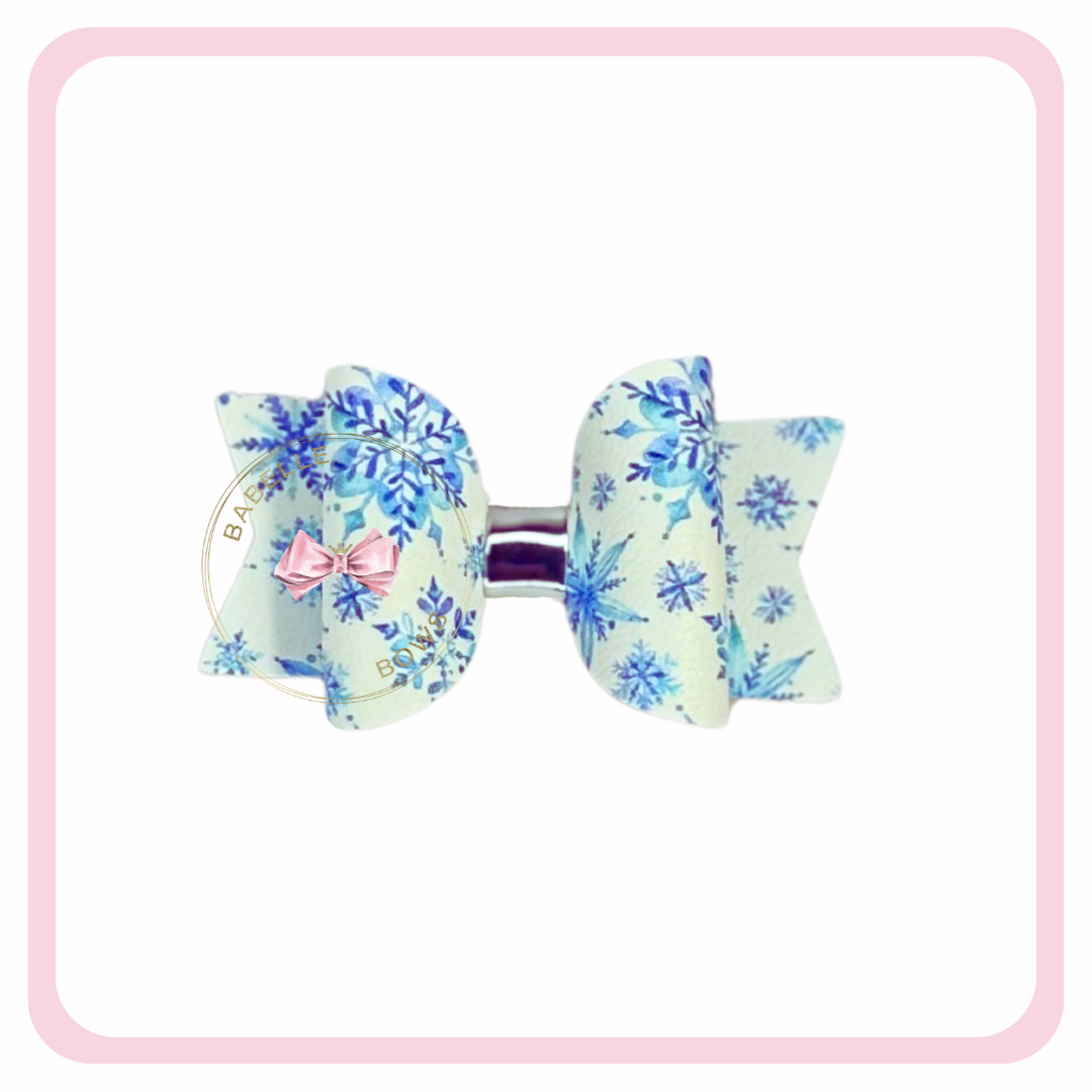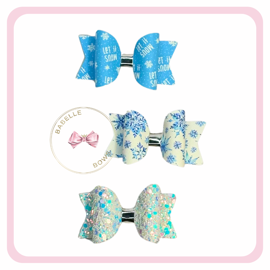 These three beautiful Blue Snowflakes make a delightful winter ensemble for your hair. Stay on trend with the let it snow hair bow, channel the spirit of Elsa with the frozen glitter bow, and add a touch of snowflakes sparkle to complete the look. All three bows measure 2.5 inches and are made from high-quality materials, perfect for a chilly winter's day! Get ready to rock your winter-wonderland windswept ‘do!
