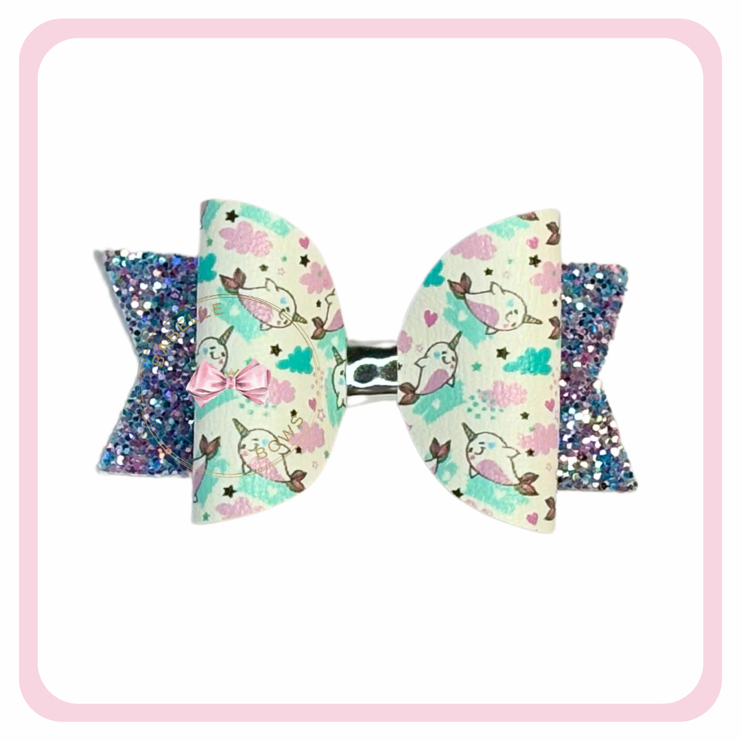 Adorn yourself in a handmade narwhal-print faux leather bow - perfect for narwhal fans both tiny and tall. Measuring in at 3.25”/8cm, this fab find is finished up on a top-notch, stainless steel alligator clip!